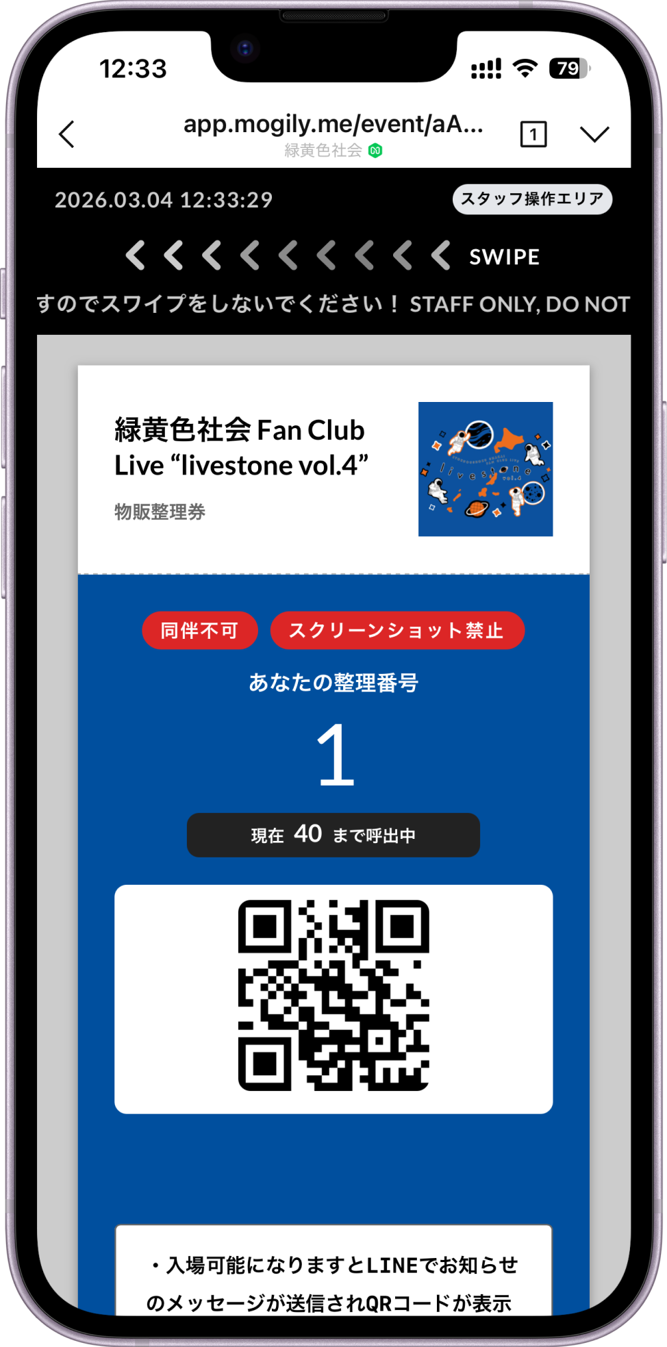 - ⼊場可能番号になるとLINEでお知らせが届きQRコードが表⽰されますのでグッズ販売担当スタッフへお⾒せください。(⼊場可能番号前はQRコードが表⽰されないので⼊場できません)