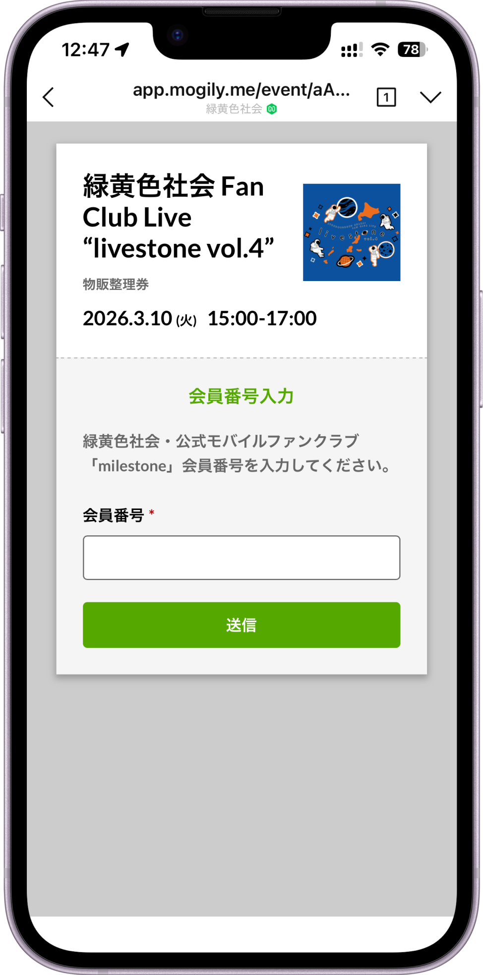 物販整理券の受付については、緑黄色社会・公式モバイルファンクラブ「milestone」会員限定となります。